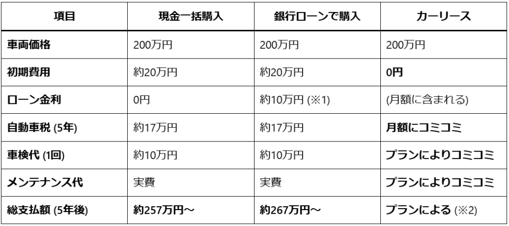表の通り、購入の場合は税金や車検のタイミングで大きな出費が発生します。一方、カーリースはこれらを月額料金に含めることができるため、「高く見えるが、実は将来の出費を平準化している」という側面があるのです。金利の低いローンを組めたり、メンテナンスを自分で安くできる場合は購入の方が安くなる傾向にあります。