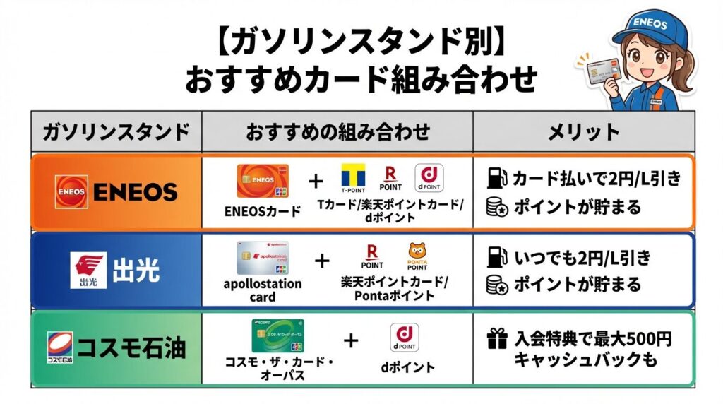 主要なスタンドごとに、一番お得になる支払い方の組み合わせをまとめました。