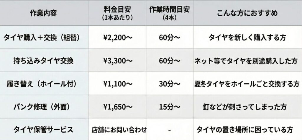 ※上記はあくまで目安です。車種やタイヤサイズ、廃タイヤ処理料、店舗の設備状況によって料金は変動します。