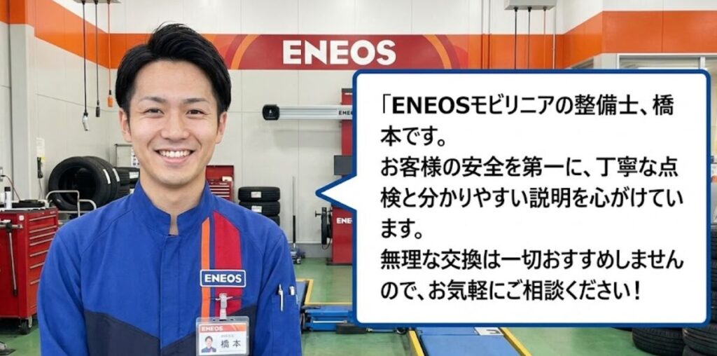 【プロからのワンポイント】 少しでも「あれ?」と思ったら、迷わずENEOSモビリニアへお越しください。プロの目で無料で点検し、お客様の不安を解消します。無理な交換は一切おすすめしませんので、ご安心ください。