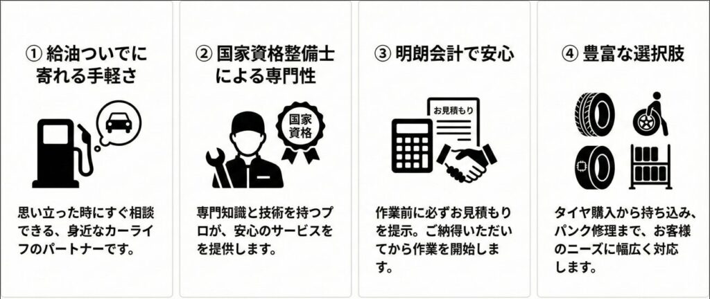④ 豊富な選択肢: タイヤ購入から持ち込み、パンク修理まで、お客様のニーズに幅広く対応します。