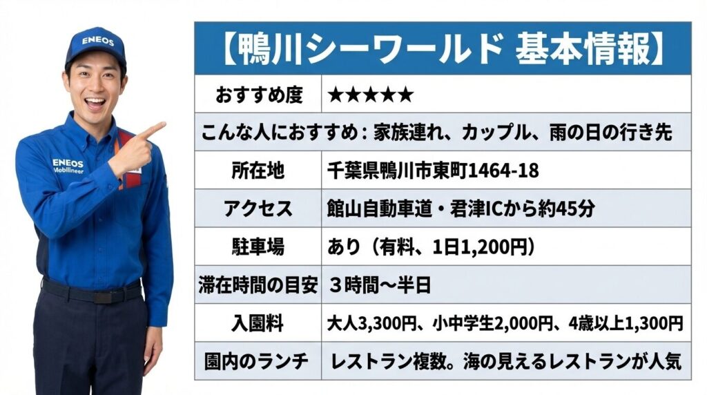 - 鴨川シーワールド (★★★★★) – 屋内施設充実、ショーは雨でも開催