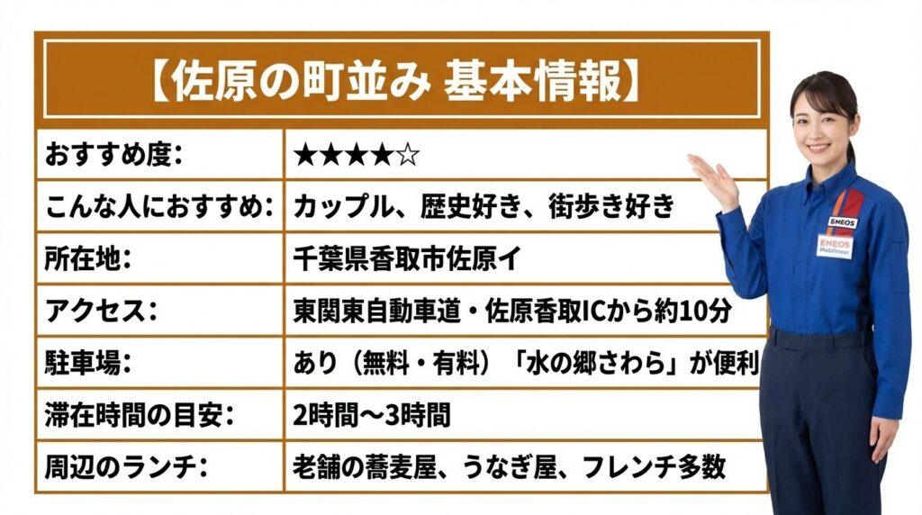 イベント: 夏と秋には「佐原の大祭」が開催され、豪華絢爛な山車が町を巡ります。