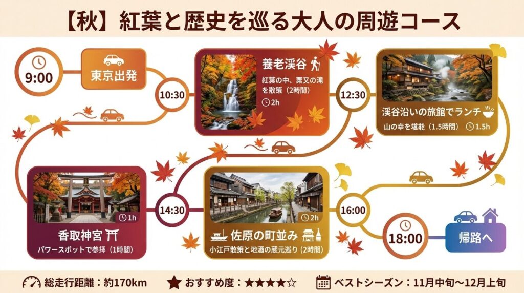 秋の紅葉と歴史スポットを満喫する大人のルート。