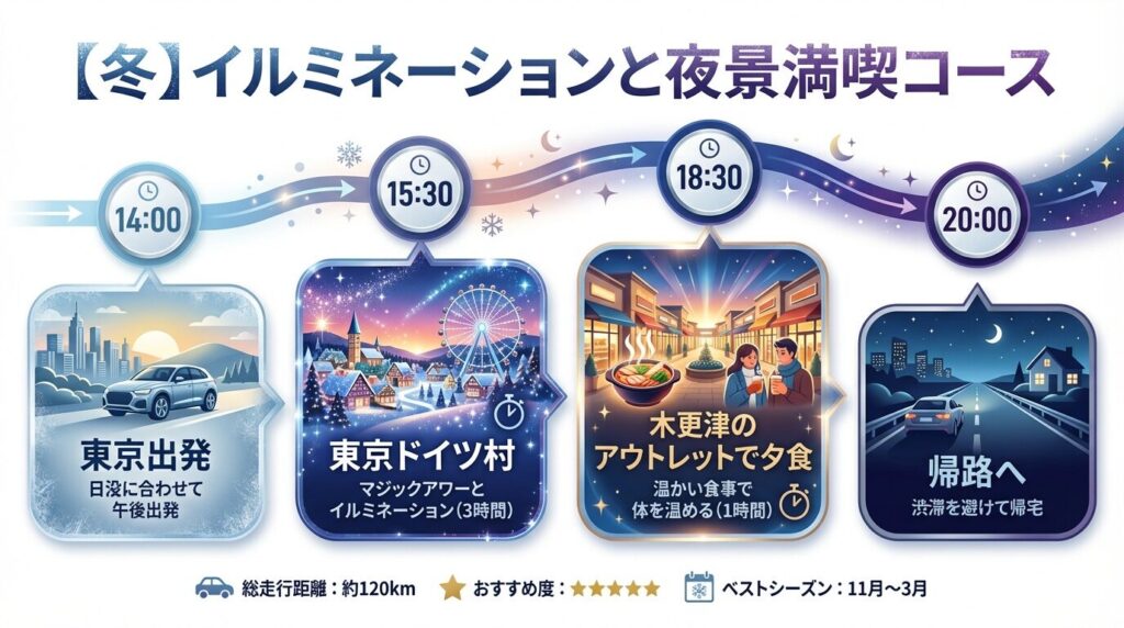 冬の夜を彩る光のイベントを楽しむロマンティックコース。