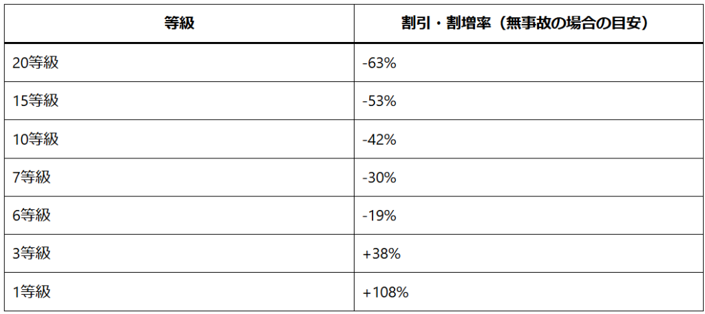 等級ごとの割引・割増率の目安は以下の通りです。20等級になると60%以上の割引が適用され、保険料が大幅に安くなります。 (※割引率は保険会社や事故の有無により異なります)