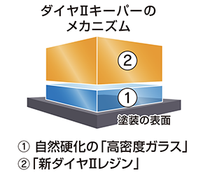 ダイヤIIキーパーは、高密度ガラス被膜をベースに、新開発の有機レジン被膜「新ダイヤIIレジン」を重ねた2層構造。 従来のエコダイヤキーパーの防汚性能はそのままに、 美しく、劇的に性能がアップした新しいボディガラスコーティングです。