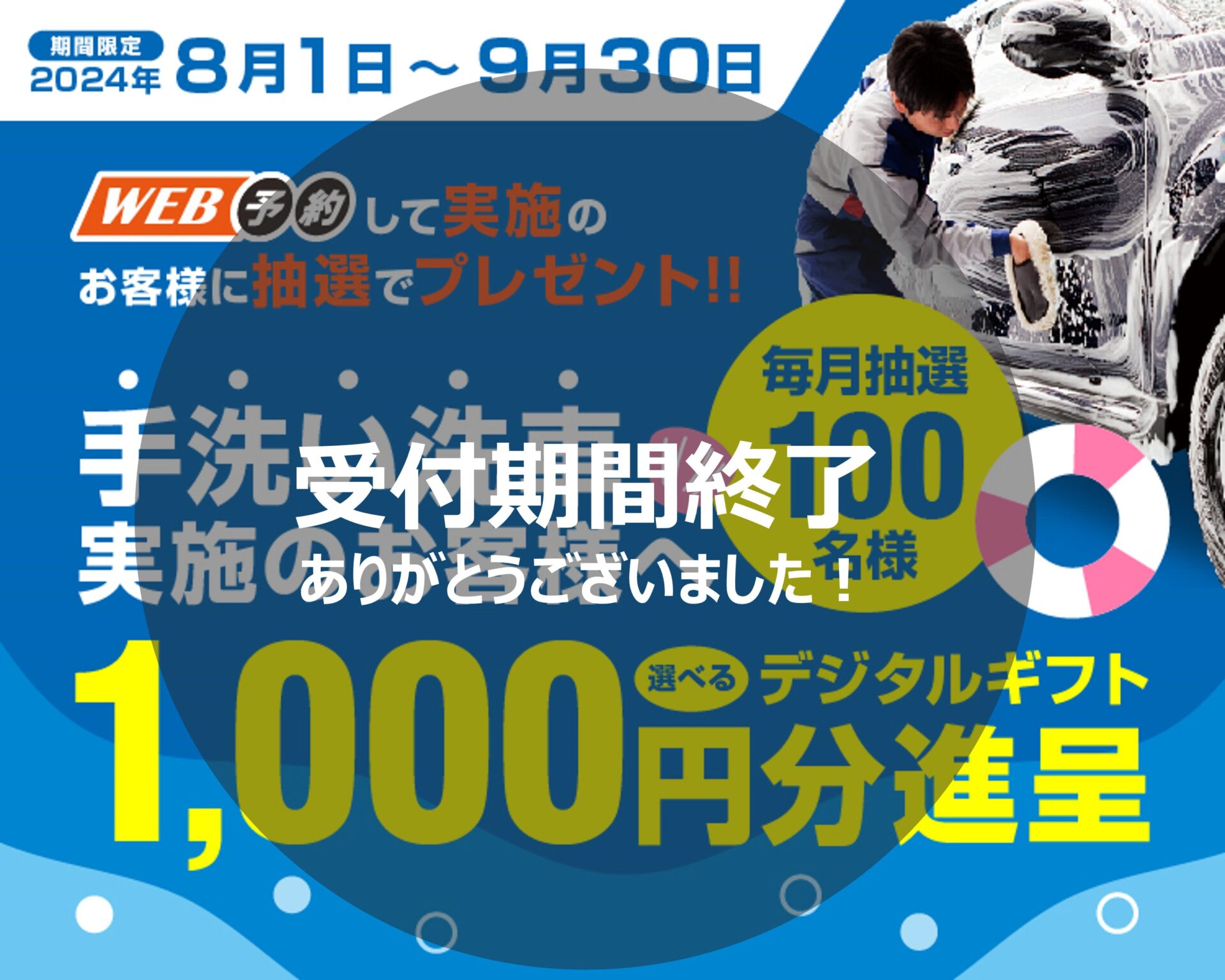 手洗い洗車をWEB予約して実施していただくと抽選で毎月100名様(2ヶ月間合計200名様)