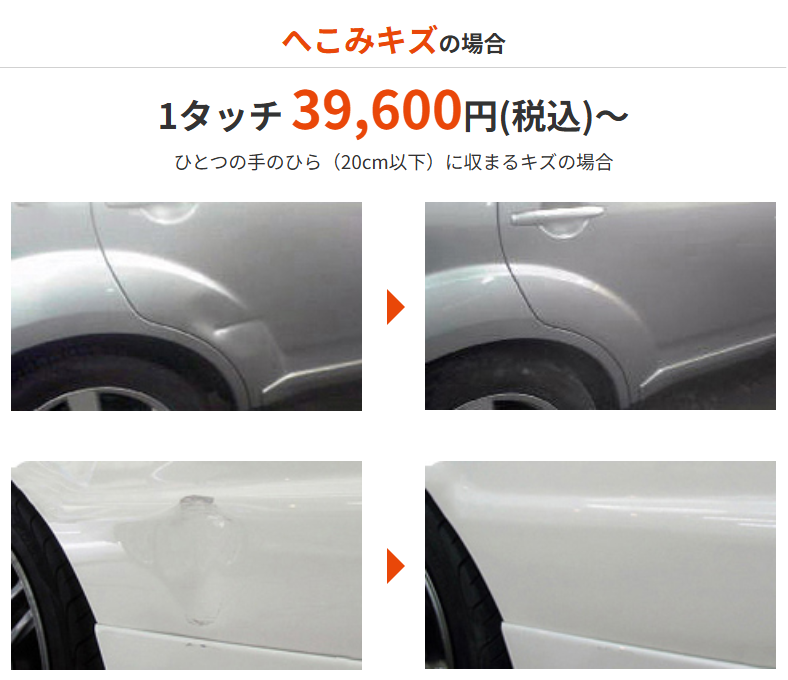 ENEOSモビリニアのリペアは「手のひらサイズの線キズ(20㎝)」を1タッチとして19,800円、ヘコミキズの場合は39,600円のわかりやすいお見積りシステムです。
