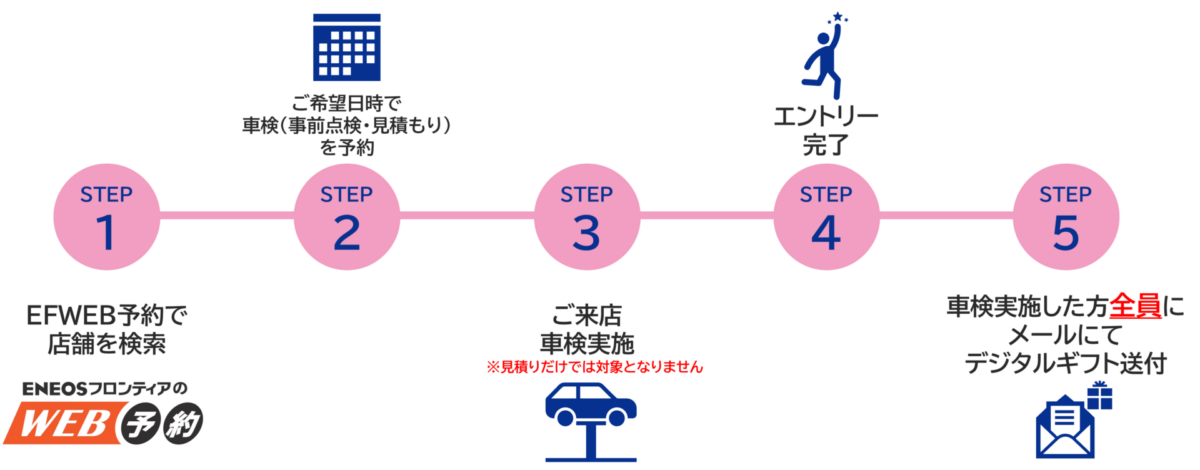 キャンペーン期間中にENEOSモビリニアWEB予約HPから車検事前点検WEB予約を行い、期間中に車検事前点検を実施し、その後期間中に車検実施したお客様に対してもれなく全員にデジタルギフト3,000円分(※1)を進呈します。